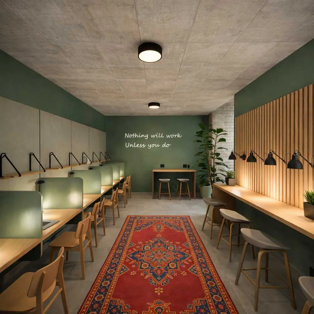 A thoughtfully designed communal work area provides a quiet, modern space for focused productivity and collaboration.