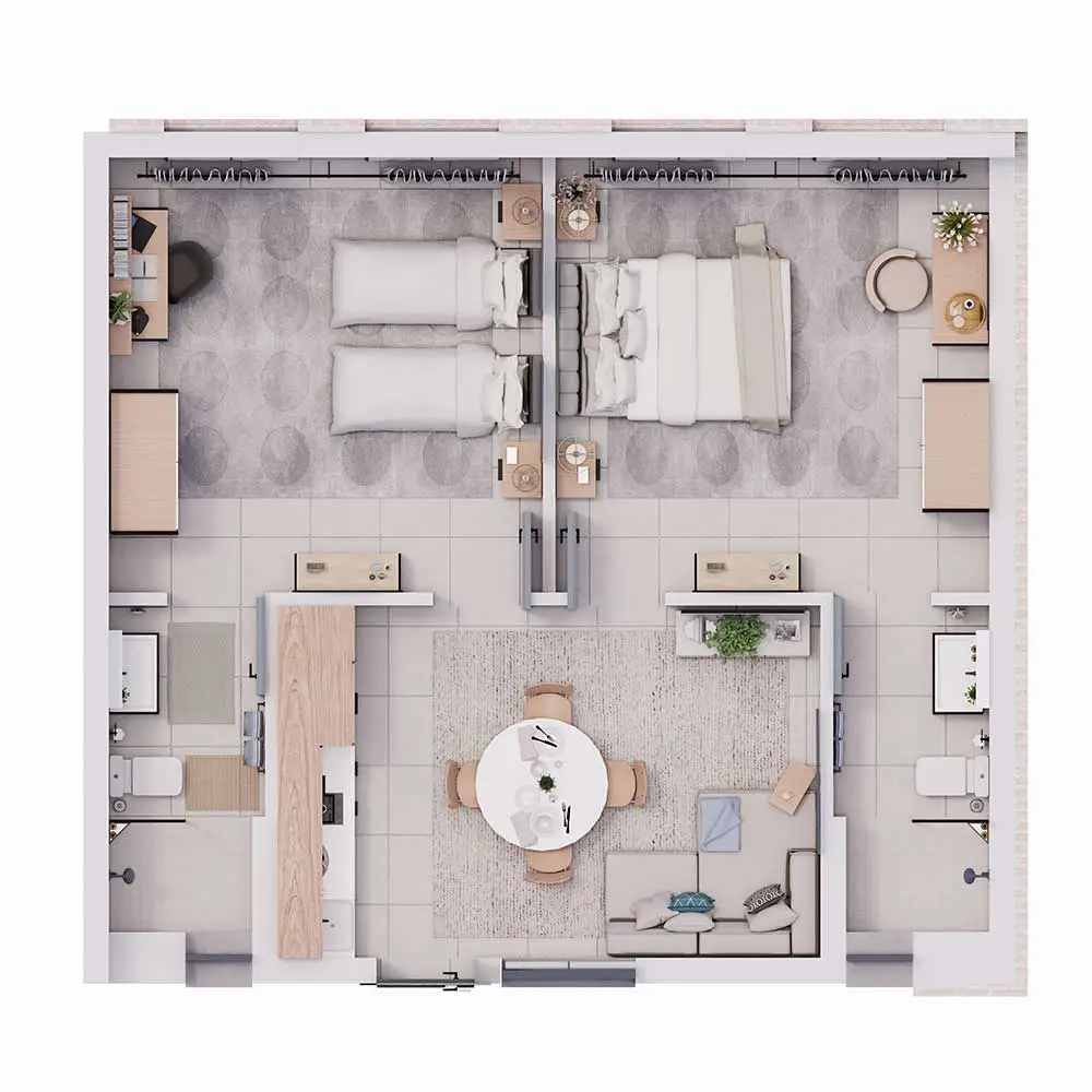 The two well-sized bedrooms provide privacy and comfort, while the central living area forms the heart of the apartment, ideal for relaxing, entertaining, or working from home. The layout balances openness with defined spaces, making it perfectly suited to young professionals who value both style and functionality.