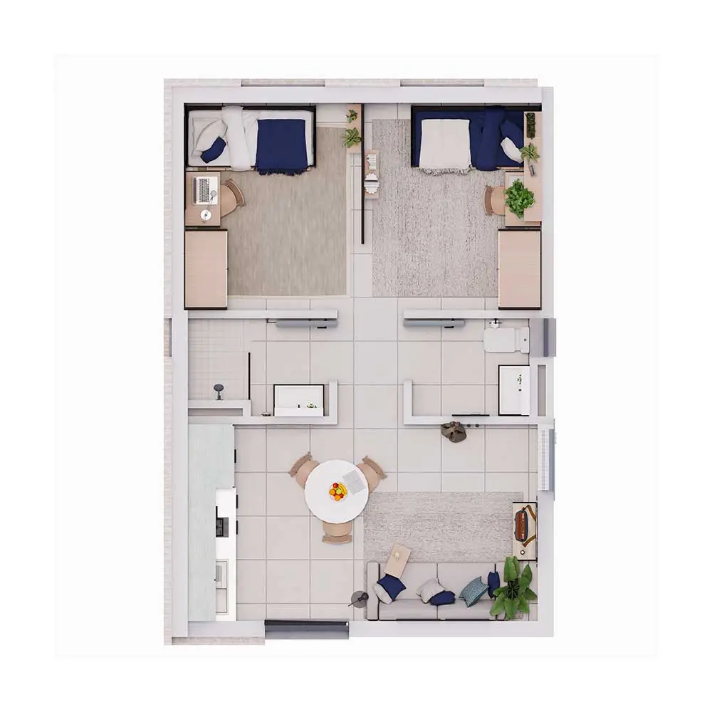 The Type C one-bedroom apartment has been thoughtfully designed to offer the perfect balance between independence and security. Compact without compromising comfort, this layout creates a safe, manageable living space that supports focused academic life while still feeling like home.